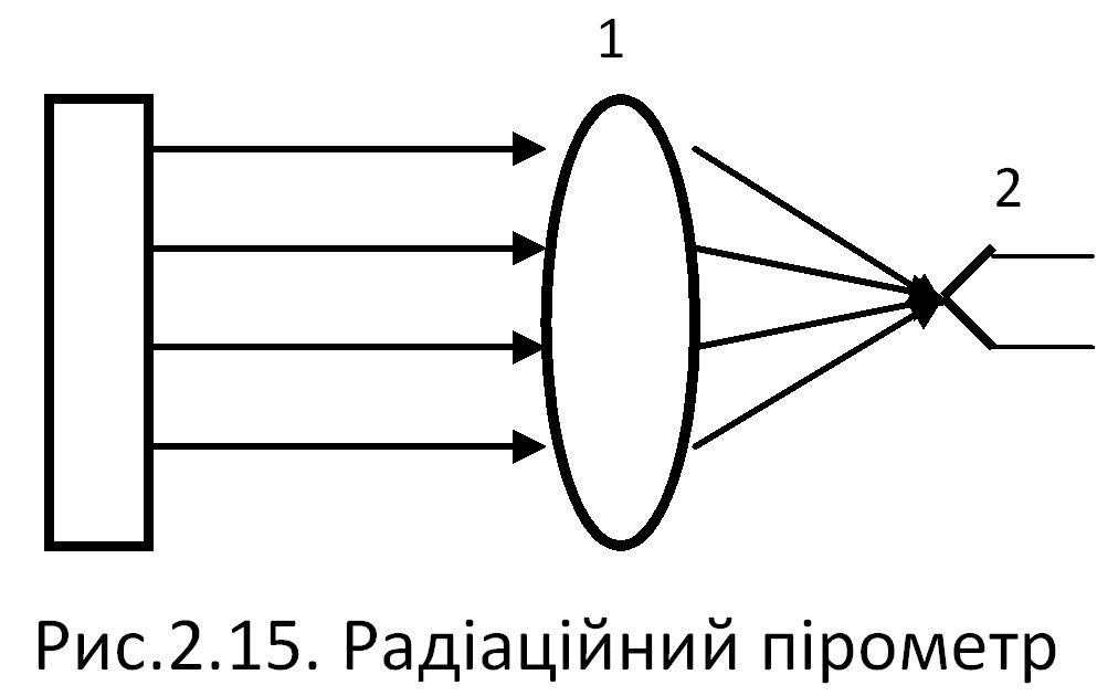 Пірометри повного випромінювання (радіаційні пірометри) використовують закон Стефана-Больцмана для абсолютно чорного тіла. Первинний перетворювач пірометра (рис.2.15) представляє собою термочутливий елемент 2, на який за допомогою спеціальної оптичної системи 1 концентрується лучиста енергія тіла, температура якого визначається. В якості термочутливих елементів широко використовуються мініатюрні батареї які складаються з (від 10 до 300) послідовно з’єднаних термопар