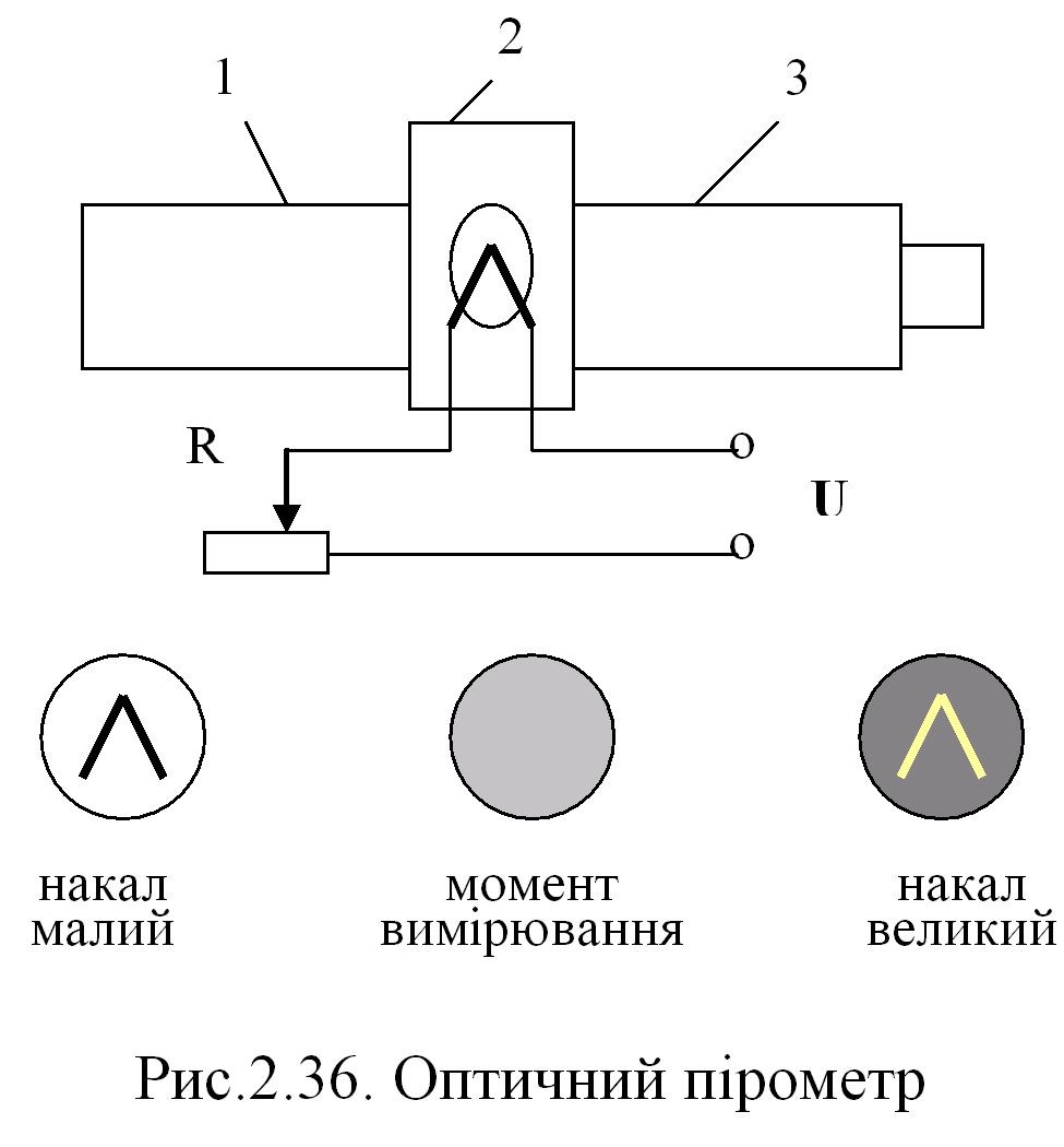 В квазімонохроматичних (оптичних) пірометрах мірою температури є енергетична яскравість об’єкта, яка визначається візуально або за допомогою фотоелектричних пристроїв. У пірометрі (2.36) потік випромінювання нагрітого тіла збирається об’єктивом 1 і проектується на площину нитки розжарювання, яскравість якої можна змінювати реостатом R. Відбувається візуальне порівняння кольору нагрітого тіла з кольором нитки розжарювання (еталоном). Вибирають таке положення реостата при якому яскравість нагрітого тіла і нитки розжарення стануть однаковими, тобто нитку розжарення не буде видно (середнє положення).